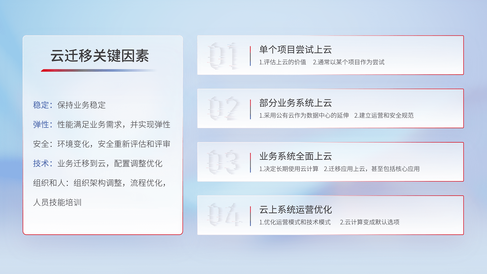 结合实际业务,,,,从规划设计、、、、云平台选型、、、云原生改造、、、数据迁移、、、、集成交付,,迁移全过程为客户识别最佳上云路径,,,做好风险识别管理,,设计网络架构、、、身份权限、、安全审计合规、、操作审计、、、、日志审计、、监控告警策略、、多站点容灾设计等,,对云上基础设施进行整体规划,,,,提升IT治理水平,,,以满足弹性、、高可用、、、高性能的需求。。