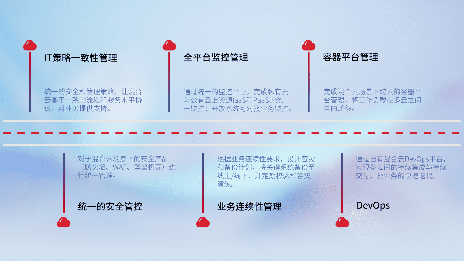 通过多云纳管,,以统一的资源数据模型把客户的云资源进行抽象和封装,,,,进而实现对多云资源的统一操作,,,保障云资源管理的可靠性、、、、稳定性与可用性。。。量身定制化运维内容,,,,配置、、、开发运维、、、、补丁管理、、、备份、、、监控、、、、认证和访问管理、、、审计和日常巡检等,,保障在用云过程中的可靠度,,稳定度以及高可用率。。。