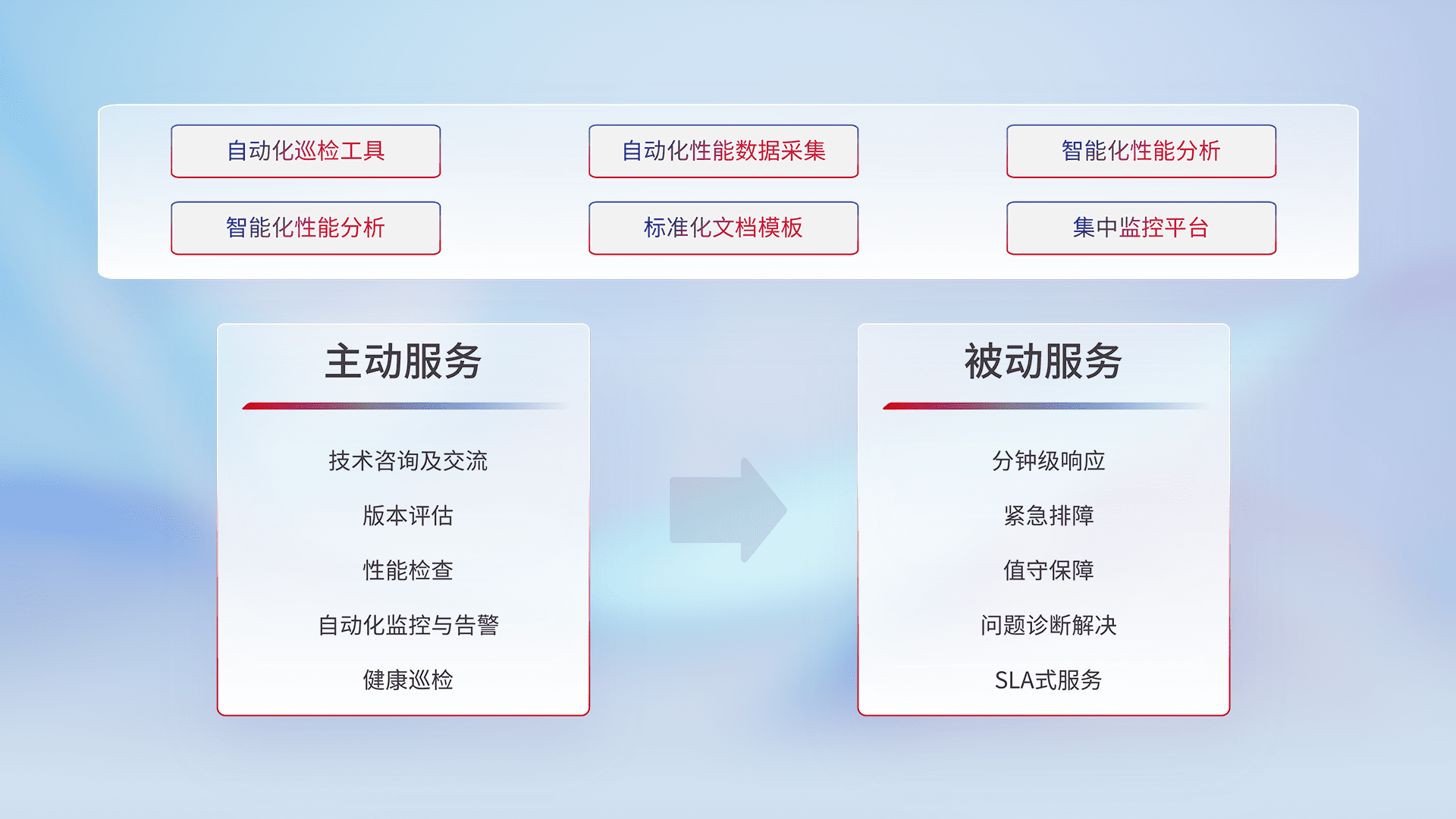 智能化工具和标准化文档,,,,保障服务质量,,,,提供主动服务(包含技术咨询、、、版本评估、、、性能检查、、、自动化监控与告警、、健康巡检)和被动服务包含(分钟级响应、、紧急排障、、值守保障、、、问题诊断解决、、SLA服务)。。